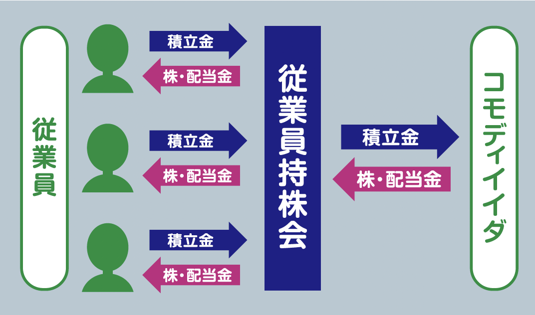 持株会という組織により、従業員が自社株を積立購入できる仕組みです。各従業員の積立金額に応じて、購入した株式や配当金が分配されます。